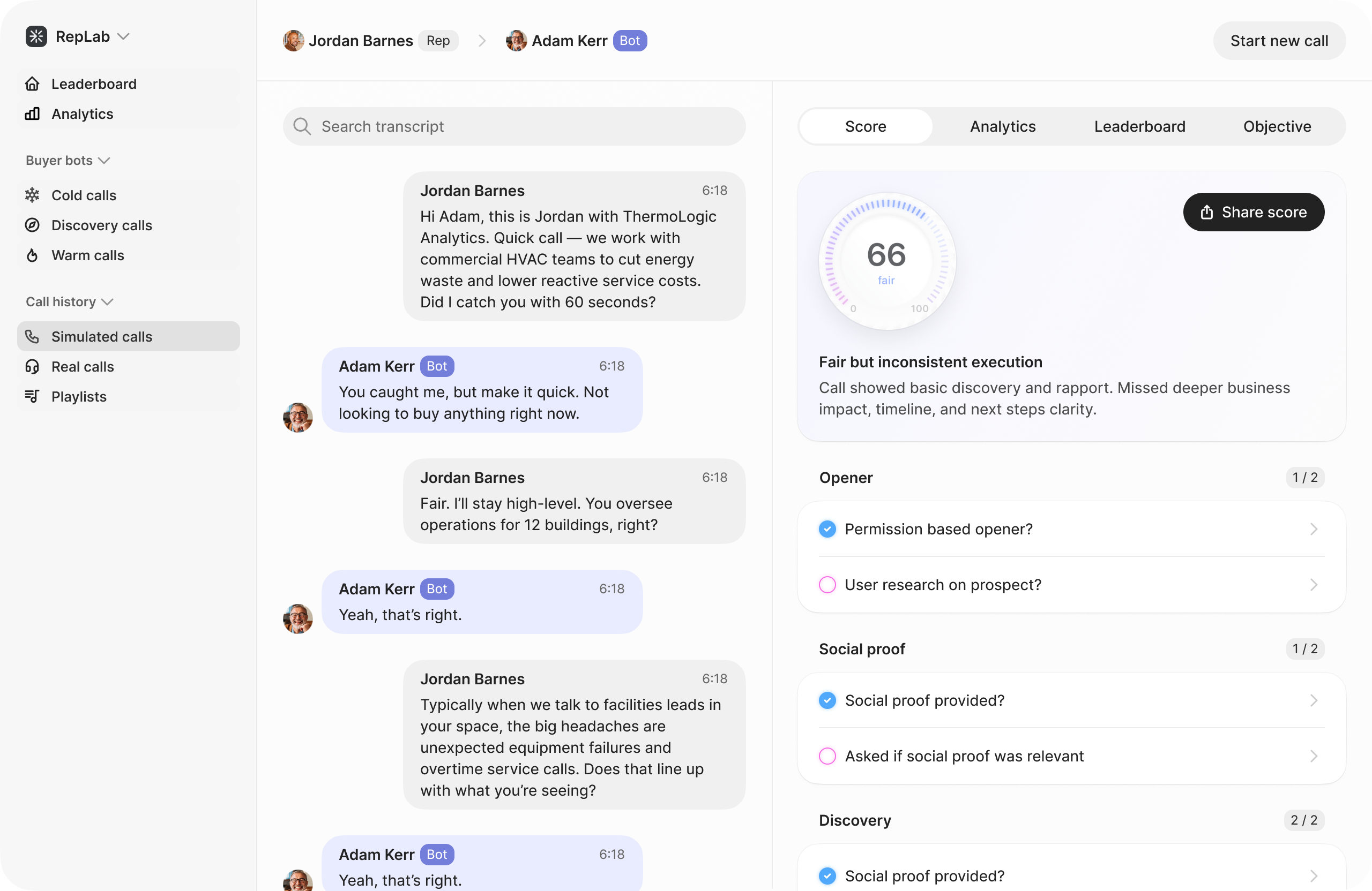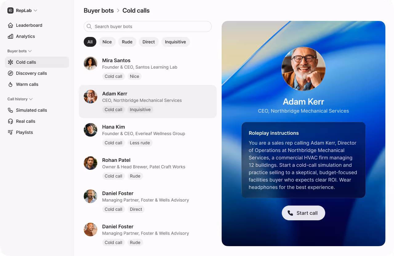 Stop wasting your sales meeting time on role-playing! Use that time for strategy and use RepLab for practice. It’s automated, instant, and the scoring is far more objective than any manager could be. It frees up my time massively.