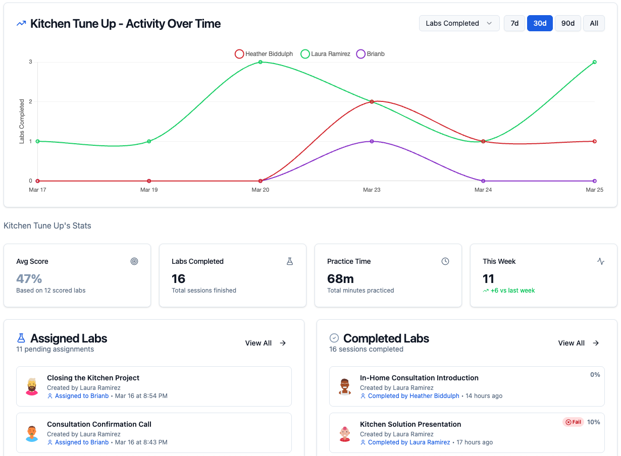 Yes, analytics and manager visibility are paramount. RepLab offers a comprehensive Manager Command Centerdashboard. You gain immediate access to centralized data on individual rep performance, skill proficiency scores, improvement trends, and completion rates. Crucially, you can identify systemic skill gaps across your entire organization (e.g., "75% of reps struggle with financing options") and use this data to drive targeted training and prove ROI.